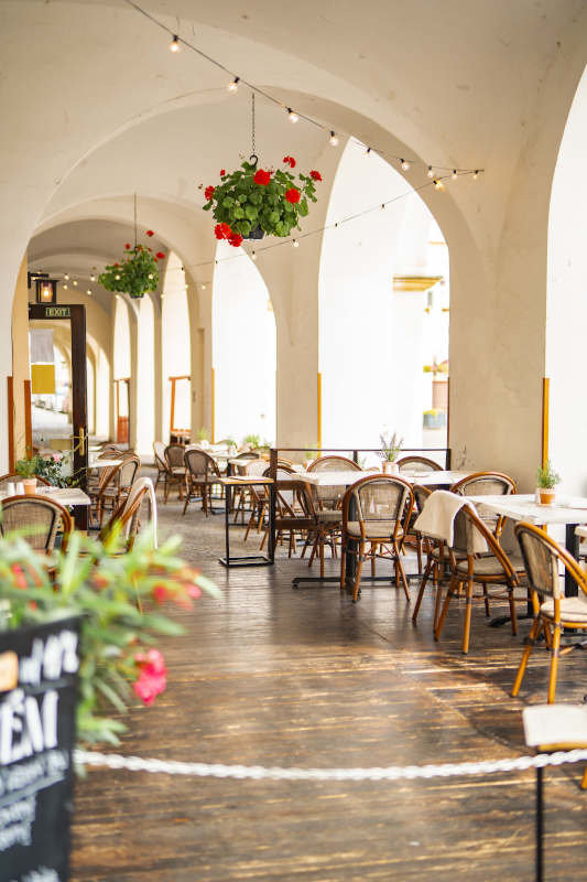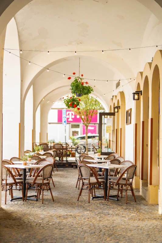 V samotném srdci města Kolína na rohu Karlova náměstí a rušné Kouřimské ulice najdete ARCO café & restaurant. Na zahrádce ve stínu podloubí jsou stoly s werzalitovými deskami v rozměru 70x70cm na litinových podnožích. Sezení zajišťují stohovatelné židle REIMS s prodyšným Textylenovým výpletem.