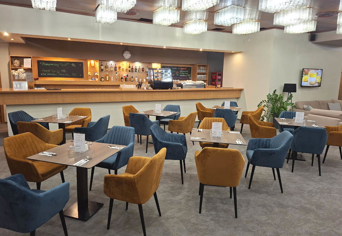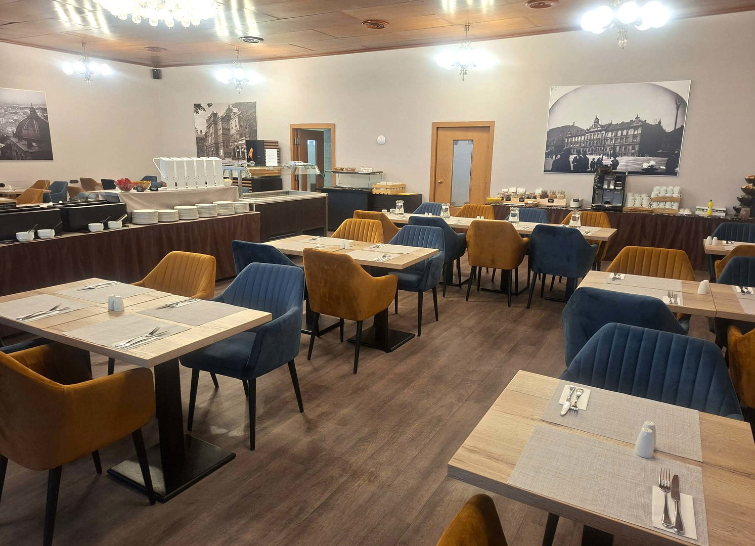 V kavárně hotelu Cascade v Mostě nabízí pohodlné posezení křesla ALFONSE Velvet v modré a zlaté barvě. Stoly mají praktickou centrální podnož BASIC 029 v černé barvě a odolnou laminovanou stolovou desku v dekoru světlého dřeva.