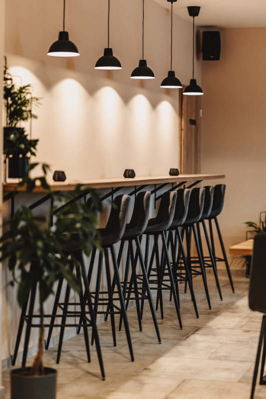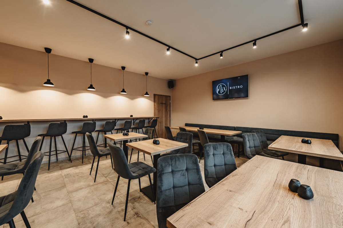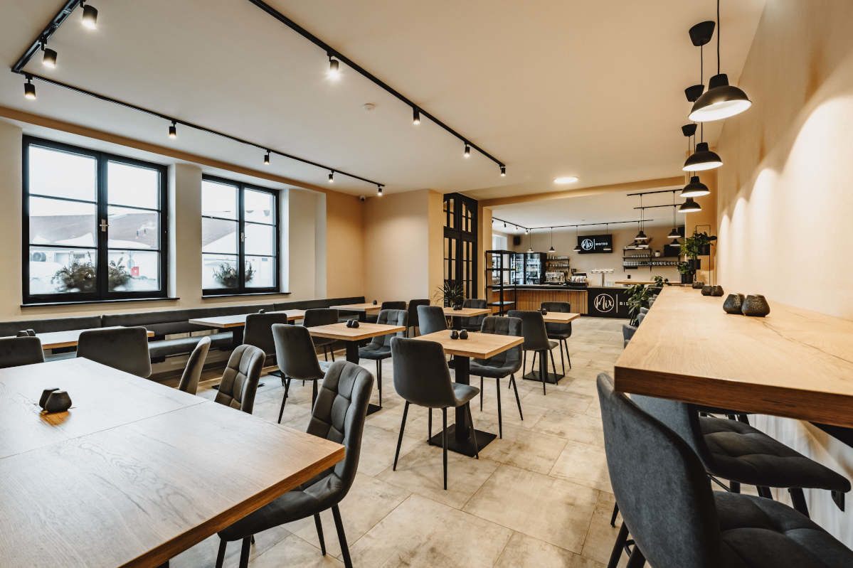 V moderním bistru ve Veselí nad Lužnicí prosvětlují interier stolové desky z odolného laminovaného materiálu v dekoru světlého dubu (Dub Halifax přírodní). Praktické jsou centrální stolové podnože PRATO 16 a PRATO 30, které se pod stoly nepletou. Posezení zajišťují čalouněné židle LAUREN. Stejný model židle jen ve vysokém provedení je u pultu podél stěny.