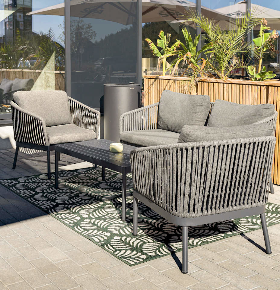 Moderní zahradní lounge set CADIX má hliníkovou konstrukci v antracitové barvě. Výplet je tvořen textilním provazem. Součástí setu jsou i látkové polštáře v antracitové barvě. Křesla jsou stohovatelná.