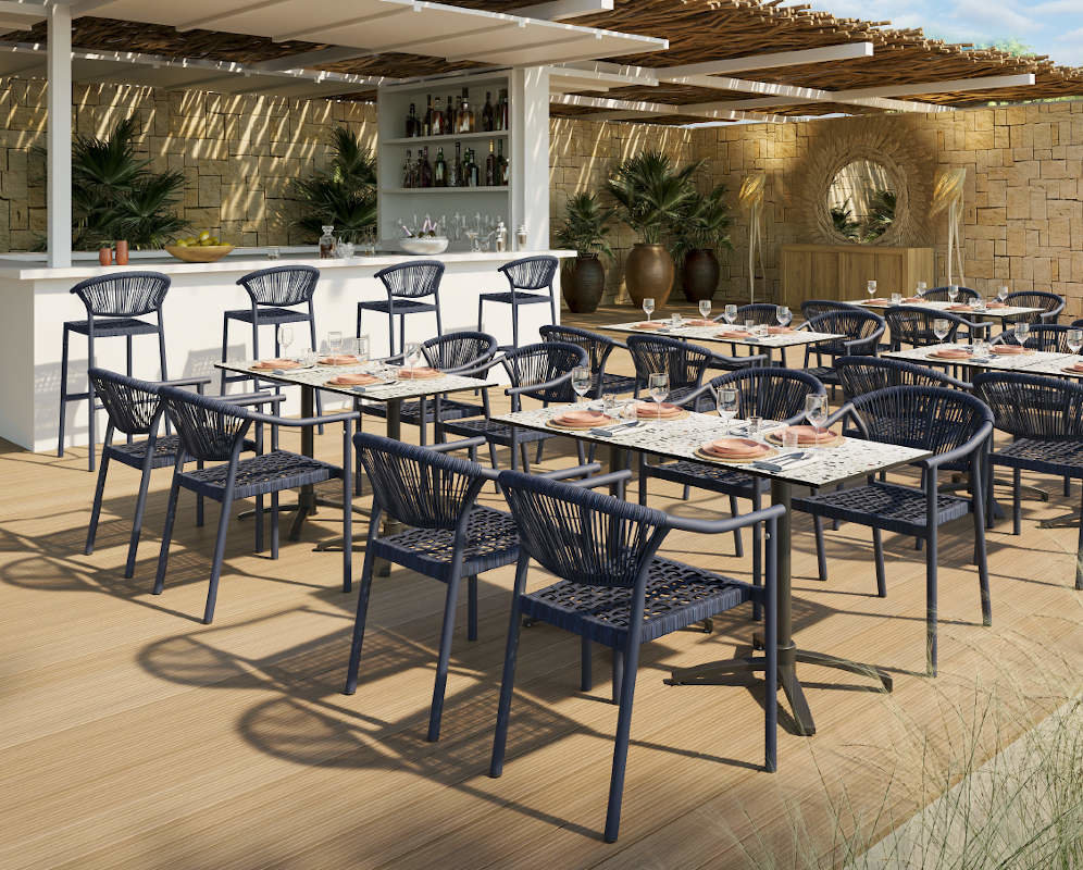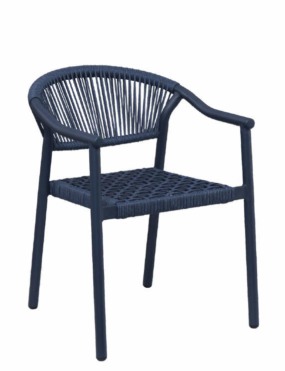 Kvalitní hliníkové křeslo DENIA s područkami je určené pro restaurace a kavárny. Kostra křesla je ošetřena práškovou barvou a je spolu s výpletem laděna do sytě modré barvy. Výhodou je nízká váha a tudíž snadné uklízení z terasy.