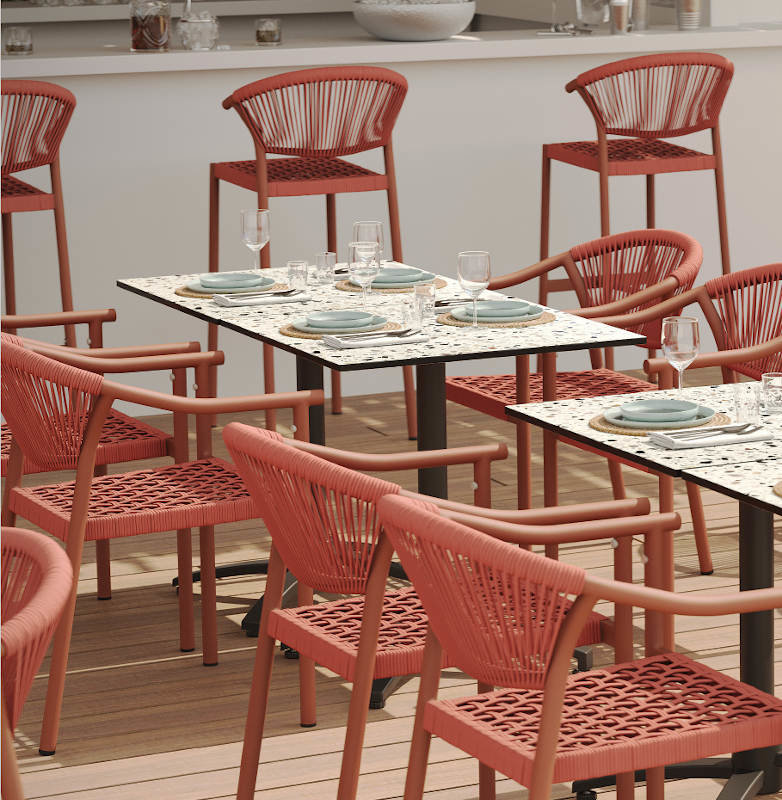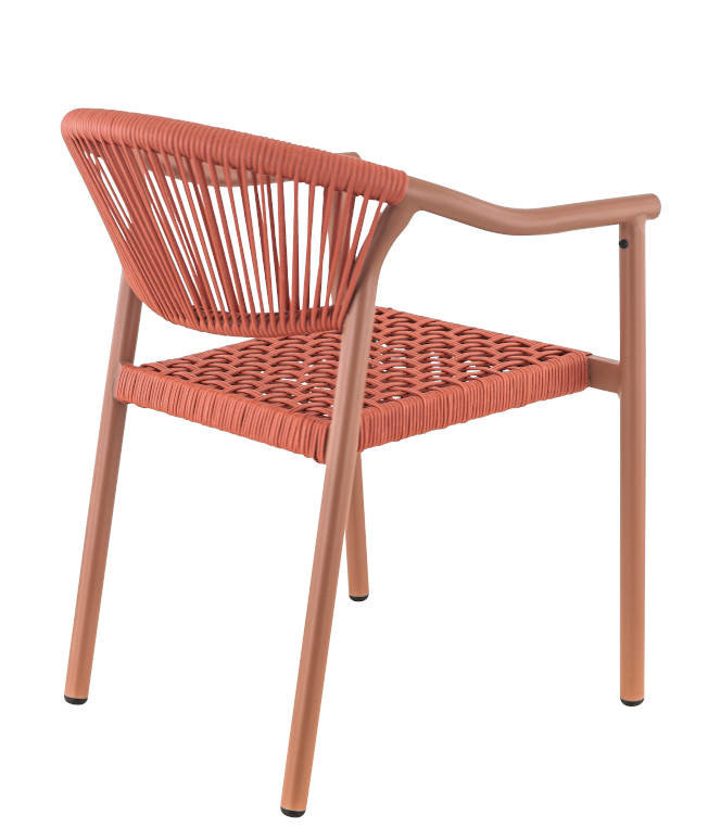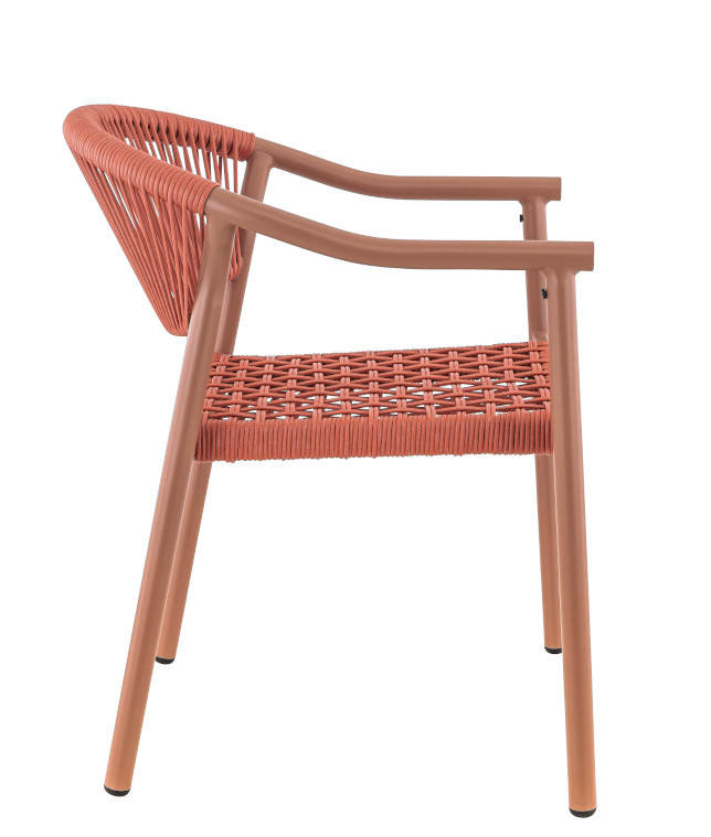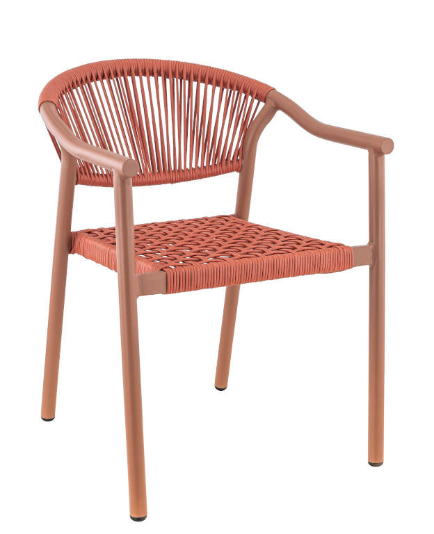 Kvalitní hliníkové křeslo DENIA s područkami je určené pro restaurace a kavárny. Kostra křesla je ošetřena práškovou barvou a je spolu s výpletem laděna do cihlové barvy. Výhodou je nízká váha a tudíž snadné uklízení z terasy.
