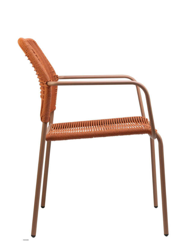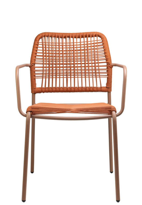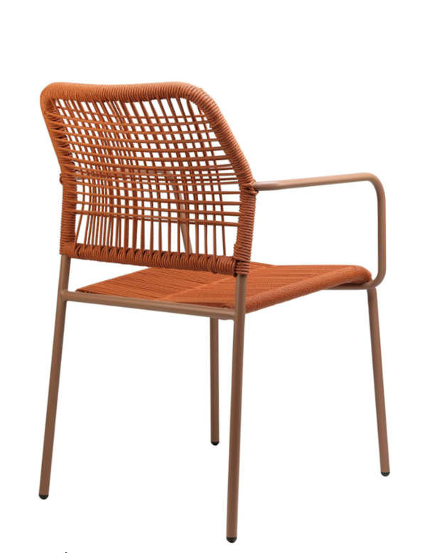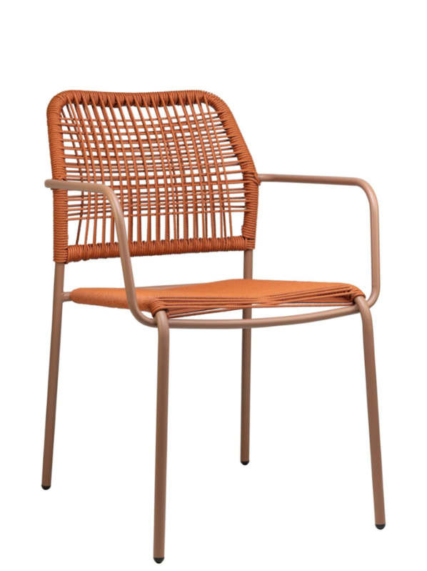 Kvalitní jednoduchá kovová židle určená pro restaurace a kavárny. Kostra židle je ocelová v "oranžové" práškové barvě. Výplet je umělý v podobně laděné barvě.
