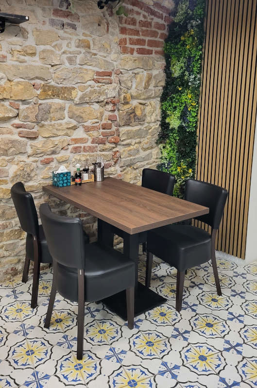 Oblíbená kavárenská židle Isabela 033 Black je vyrobená z bukového dřeva s čalouněným sedákem a opěrákem. Dřevěné části jsou mořené do tmavě hnědé barvy wenge. Sedák a opěrák je čalouněný odolnou černou koženkou. Židle Isabela jsou z výroby opatřeny plastovými (nylon) kluzáky.