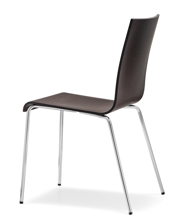 Kvalitní moderní židle s dubovou překližkou a ocelovými kulatými nohami pr.16mm. Konstrukce může být chromová nebo v práškové barvě. Sedák z dubové překližky může být v barvě bělený dub, wenge nebo antracit.
