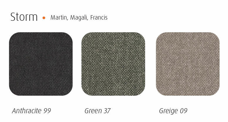 Moderní židle MAGALI má pevnou kostru černé barvy z ocelových profilů 30x15mm (tloušťka stěny 1,5mm). Přestože sedák i opěradlo jsou čalouněné, působí židle vzdušně a lehce. Materiál čalounění je látka Storm, vyrobená ze 100% polyesteru.