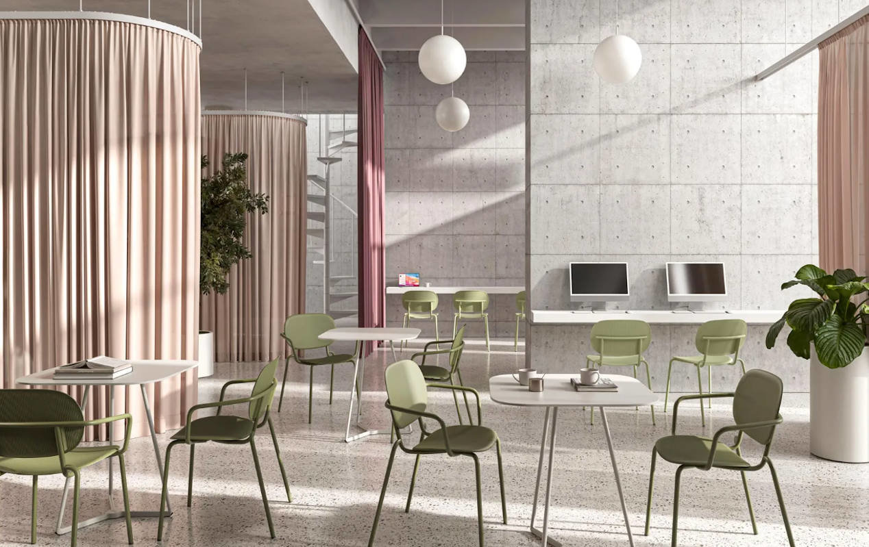 Textura, inspirovaná plynulými rytmy zvukových vln a harmonickými pohyby akustických vibrací, dodává židli jedinečný, výrazně moderní charakter. Si-Si Vibes, vyrobená z certifikovaného regenerovaného plastu s trubkovým kovovým rámem, je součástí řady Go Green od S•CAB.